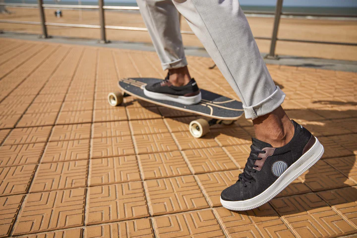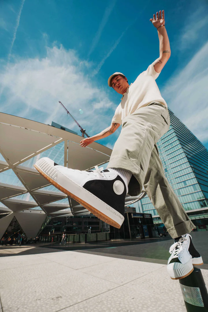 Komrads makes vegan trainers using apple leather, combining eco-friendly innovation with stylish, ethical footwear.