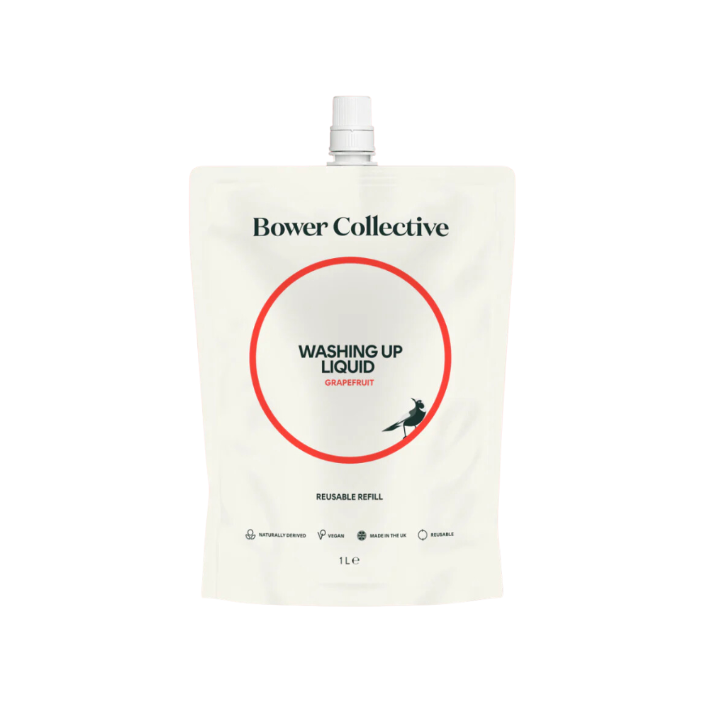 Bower Collective natural washing up liquid refill in reusable pouch with digital tracking.