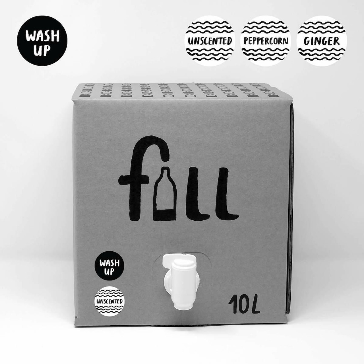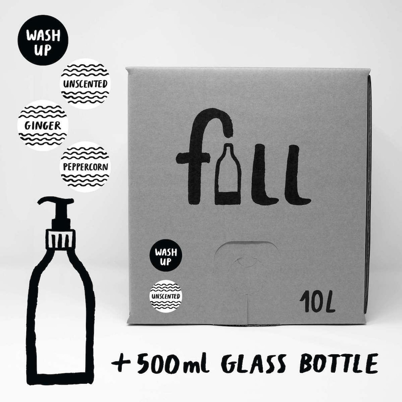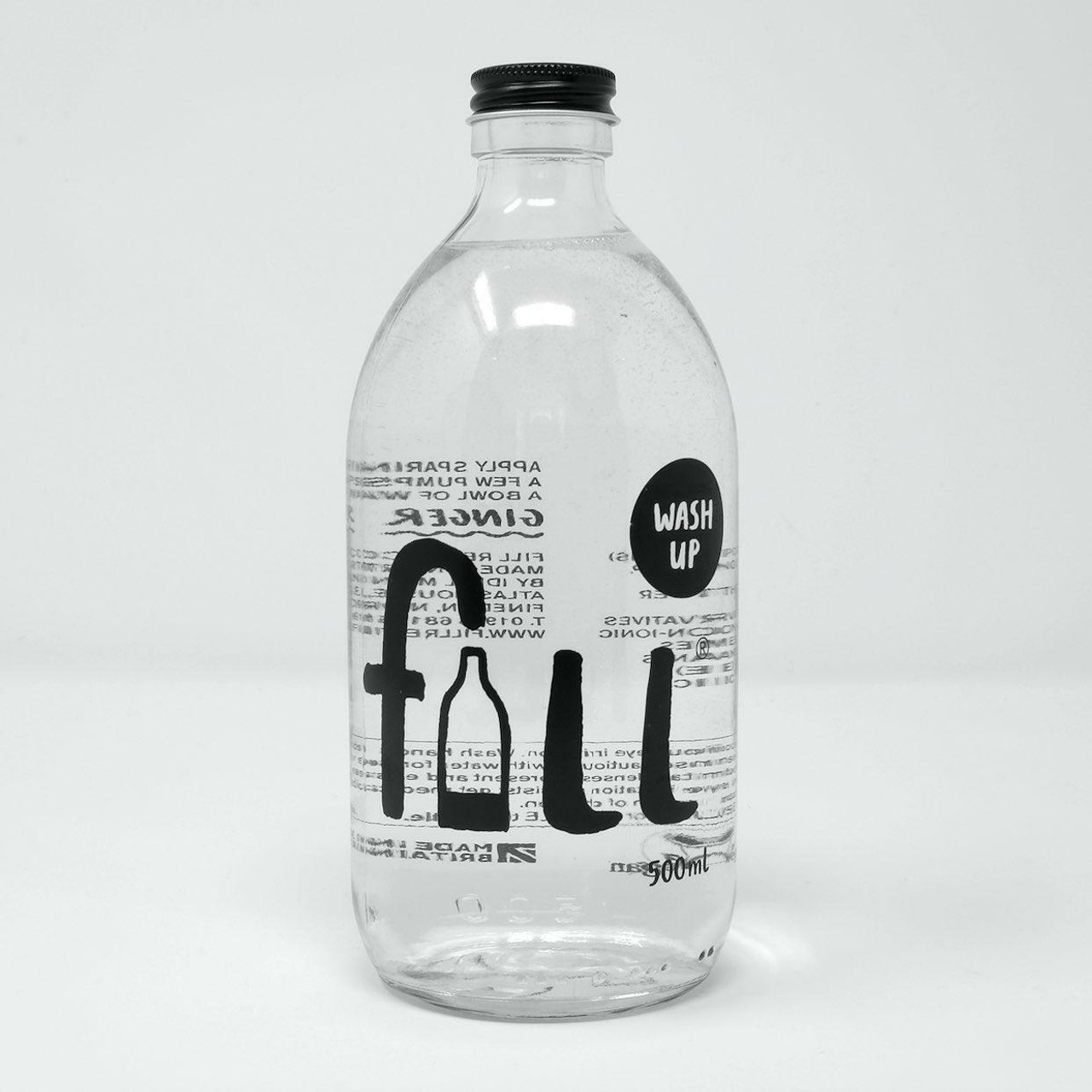 Natural and refillable washing up liquid in a glass bottle with aluminium lid or optional pump.