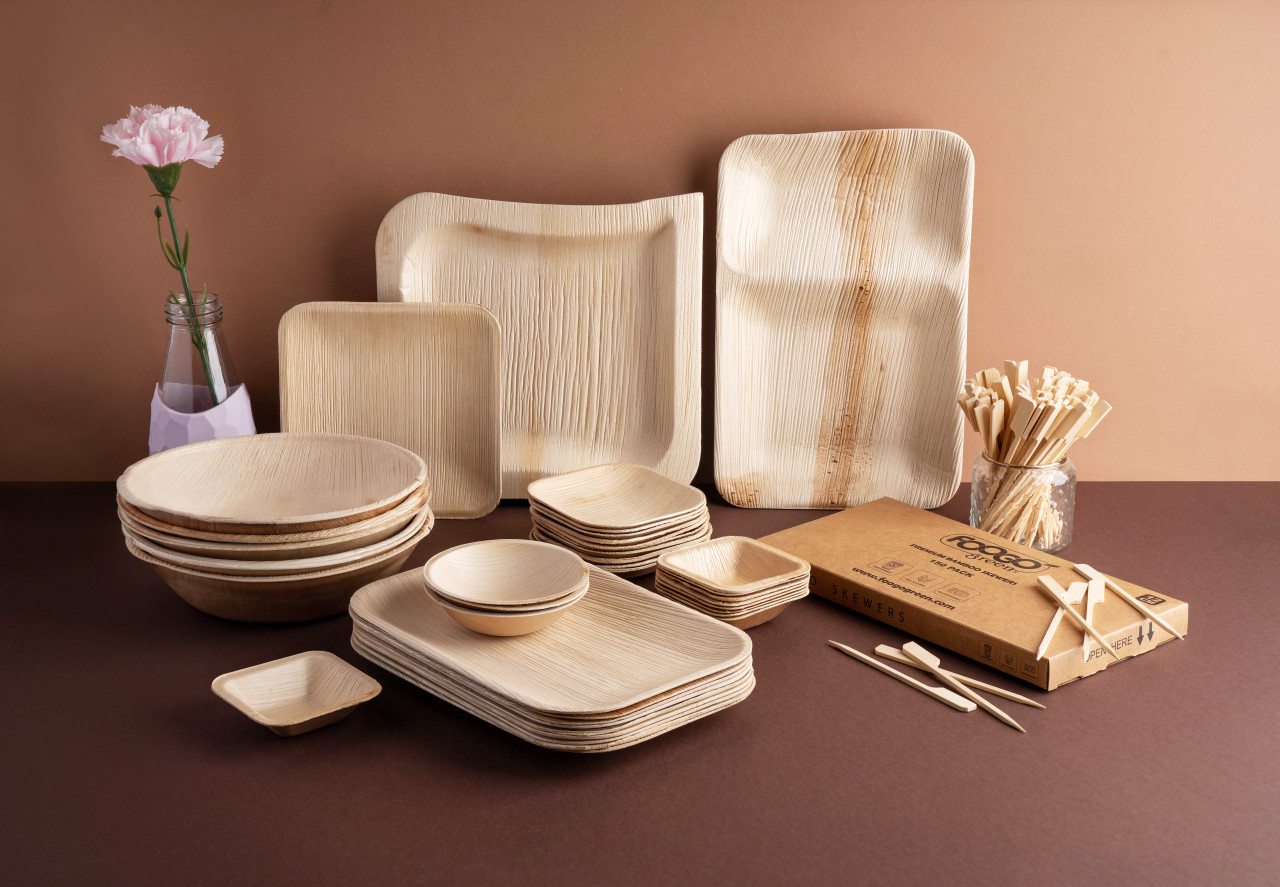 Eco-friendly disposable plates made from palm leaves that are home compostable and can be used as an alternative to paper or plastic plates.