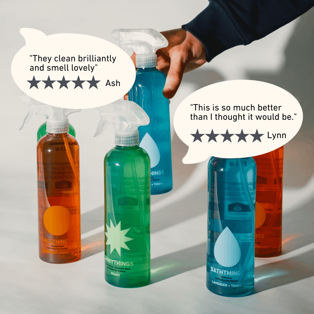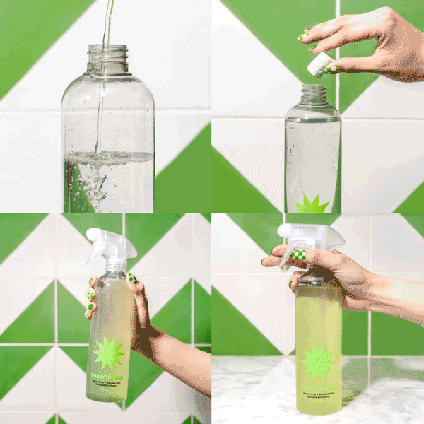 Start your refillable cleaning journey with this Cleaning Spray Starter Kit including 3 bottles and 3 dissolvable tabs.