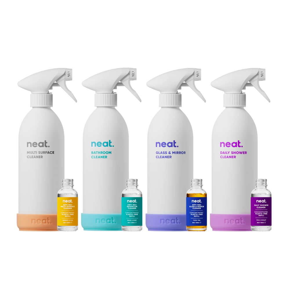 Award-winning plant-based cleaning sprays, refillable with plastic-free concentrates in recyclable glass bottles.