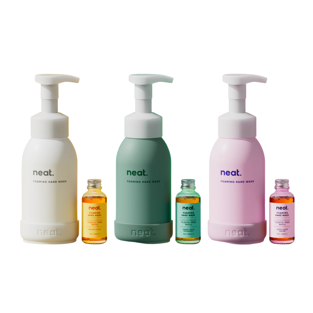 Neat's foaming hand wash comes in refillable aluminium bottles with plastic free concentrated refills in glass bottles.