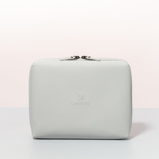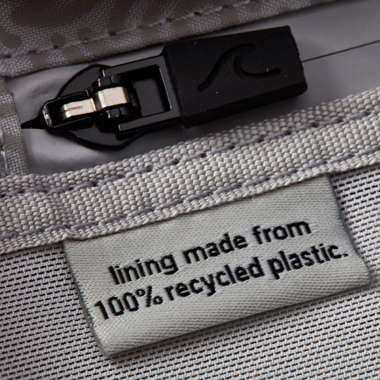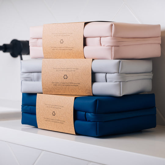 Premium vegan wash bag with a 100% recycled plastic lining and detachable clear liquid bag for travel or everyday use.