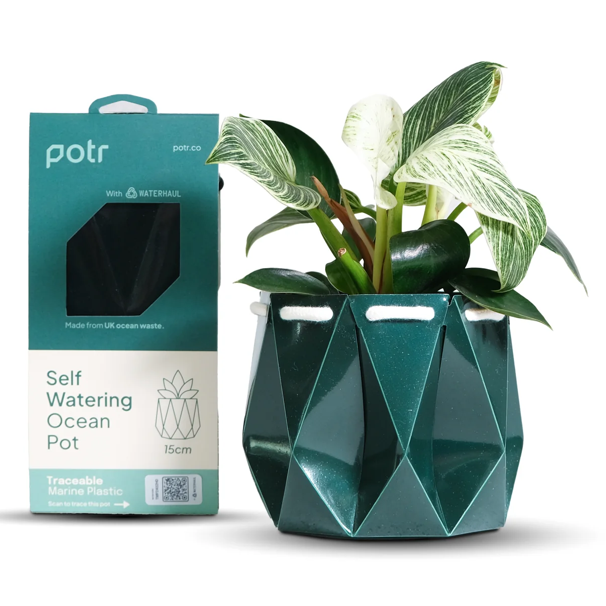 Eco-friendly self-watering plant pot made from 100% recycled UK marine plastic with traceable, low-carbon UK production.