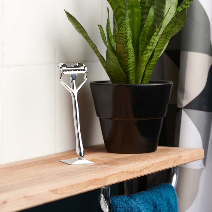 Shavent resuable razor made from die-cast zinc and designed to last forever, featuring a triple blade and pivoting head, for a plastic free shave.